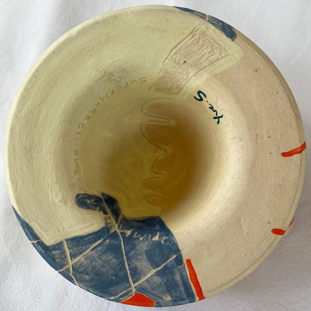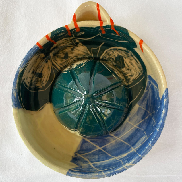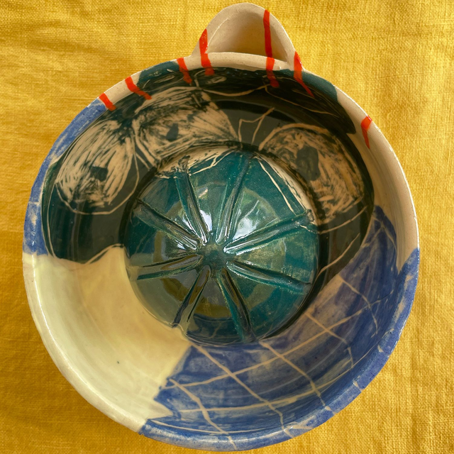 Wheel thrown stoneware pieces. Decorated with a mix of painting and sgraffito.