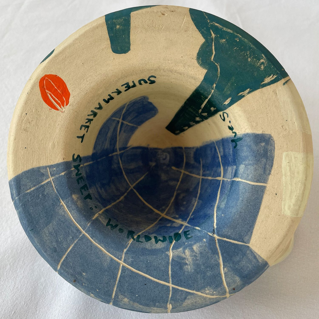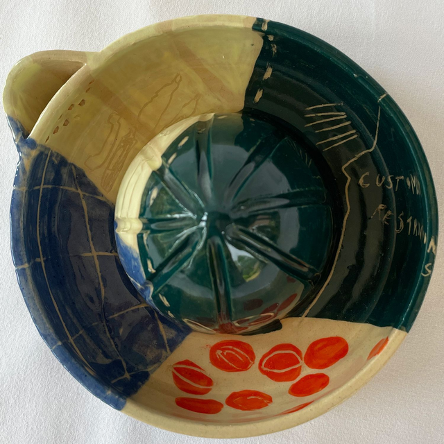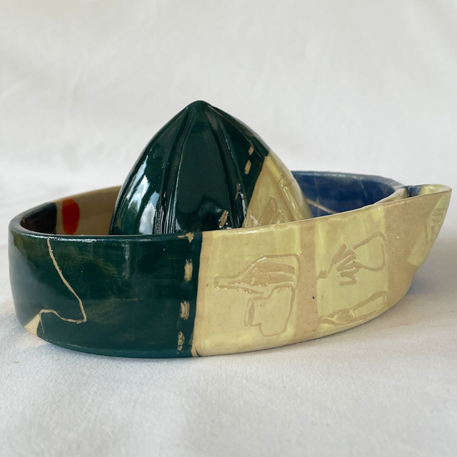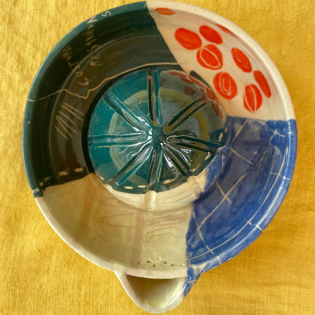 Wheel thrown stoneware pieces. Decorated with a mix of painting and sgraffito.