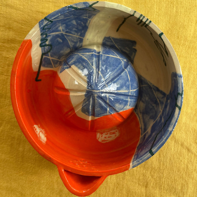 Wheel thrown stoneware pieces. Decorated with a mix of painting and sgraffito.