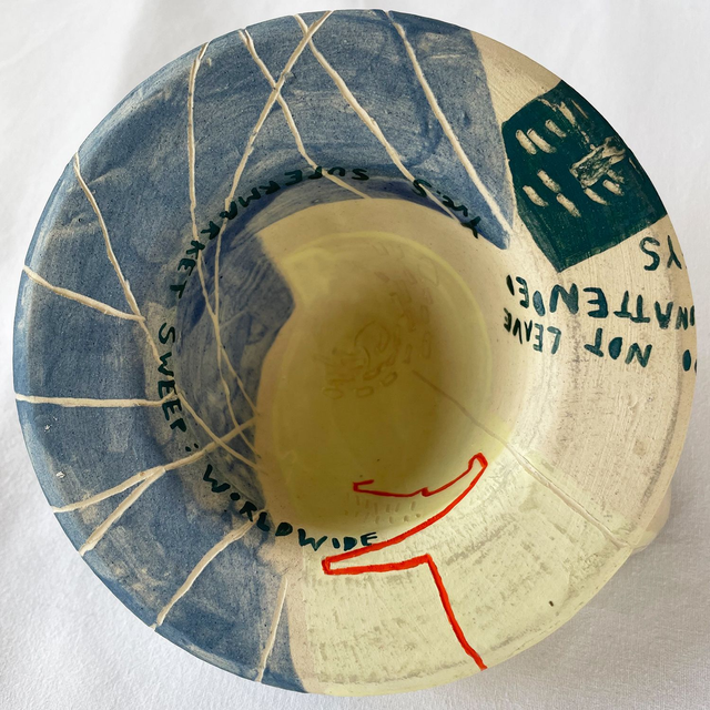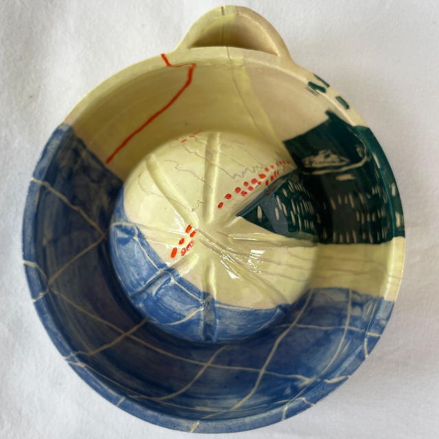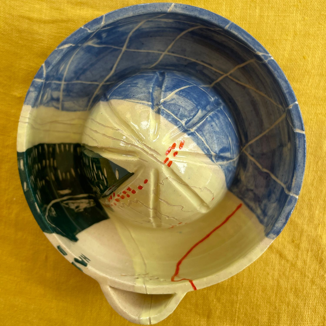 Wheel thrown stoneware pieces. Decorated with a mix of painting and sgraffito.